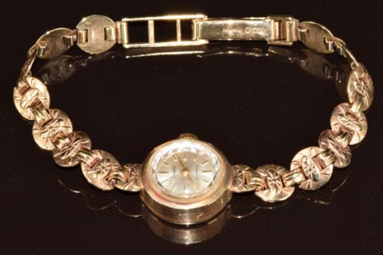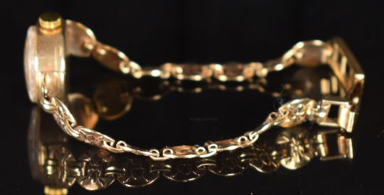 Accurist 9ct gold ladies wristwatch with gold hands and hour markers, silver dial and signed 21 jewel movement, on 9ct gold bracelet, case diameter 16mm, 12.2g