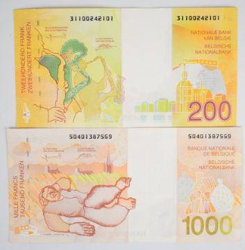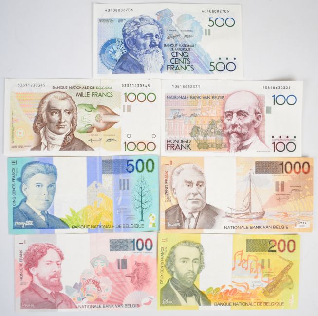 Seven pre-Euro Belgium banknotes comprising 1981-82 (undated) issue 100, 500 and 1000 Francs plus 1994-97 (undated) issue 100, 200, 500 and 1000 Francs, all seven notes have seen light circulation or exhibit minor handling defects. Both 1000 Franc notes have a single vertical fold