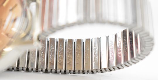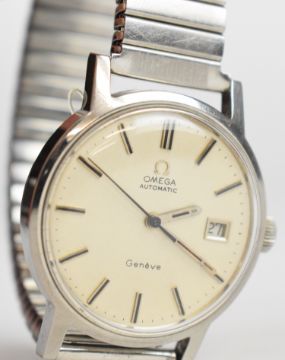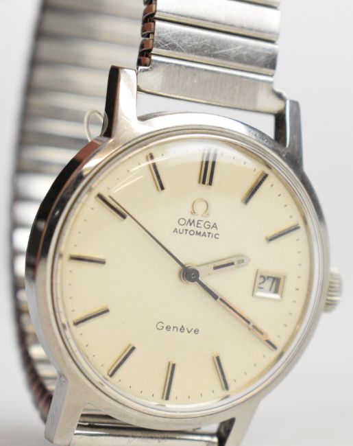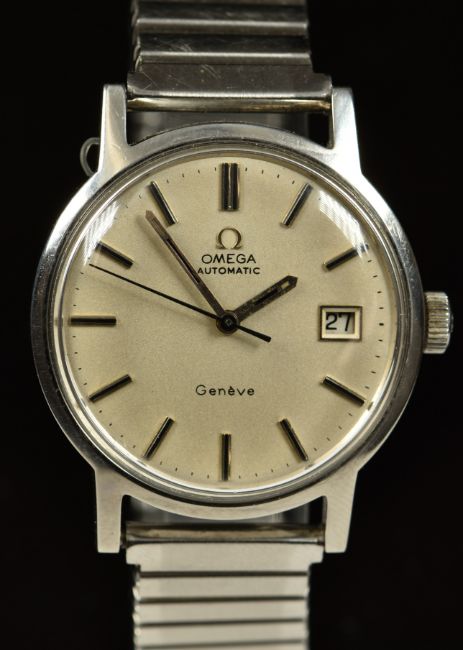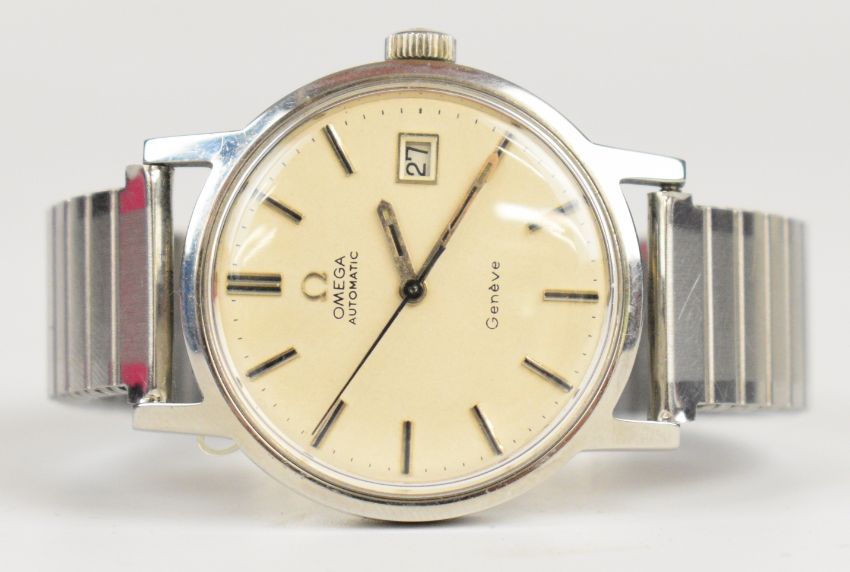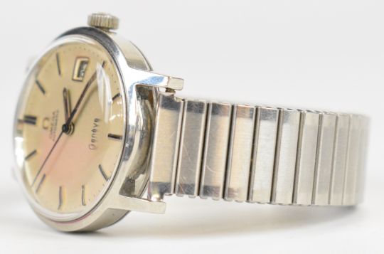 Omega gentleman's automatic wristwatch ref. 166.098 with date aperture, two-tone hands and baton hour markers, silver dial, stainless steel case and signed calibre 1481 movement, on expanding metal bracelet, case diameter 35mm, serial number 33744917.