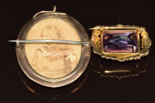 A 9ct gold brooch set with a mixed cut amethyst (9.8g, 2.8 x 2.2cm) and a yellow metal pendant/ brooch set with a pieta dura plaque (15.8g, 4.6 x 3.7cm)