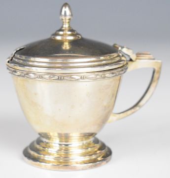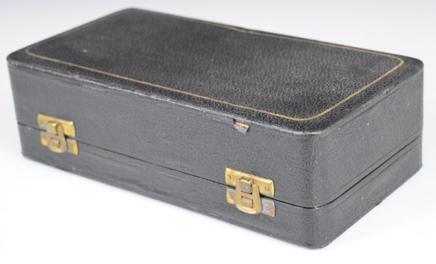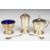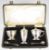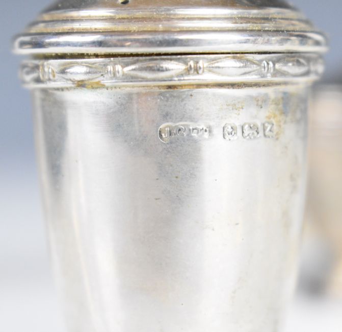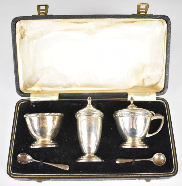Cased Art Deco hallmarked silver cruet set comprising pepper, salt and mustard, three main pieces Birmingham 1947/9, maker Joseph Gloster Ltd, width of box 22.5cm, weight excluding blue glass liners 166g