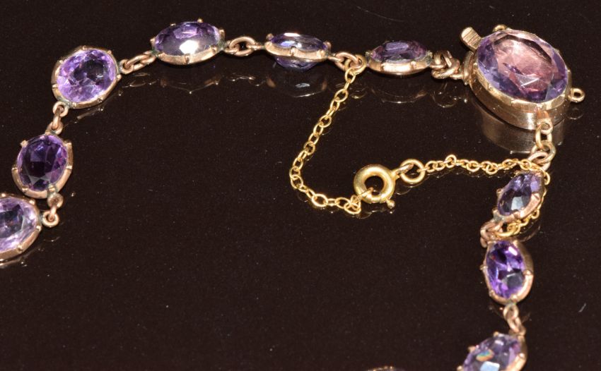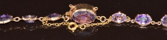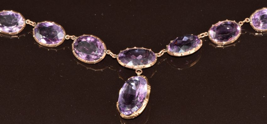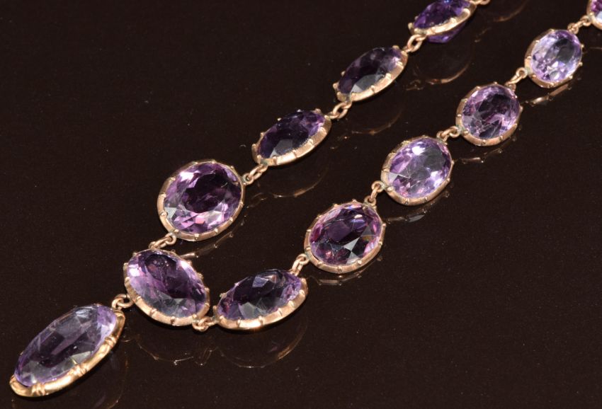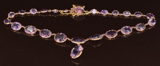 Edwardian 9ct gold necklace set with 24 graduating oval cut amethysts, the largest 9.5ct, the smallest  0.85ct, 26.3g, 40cm