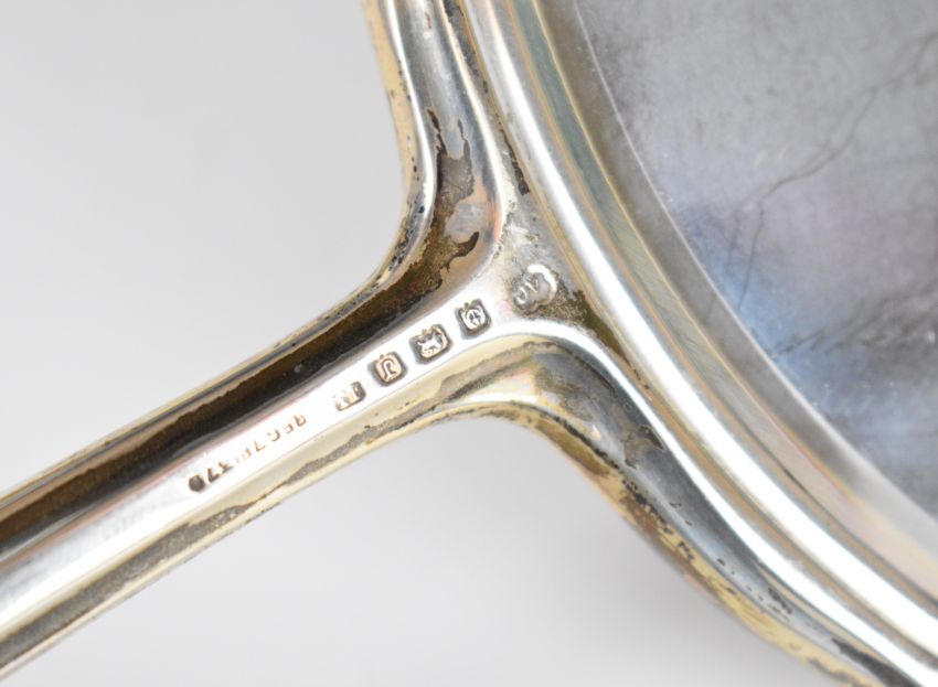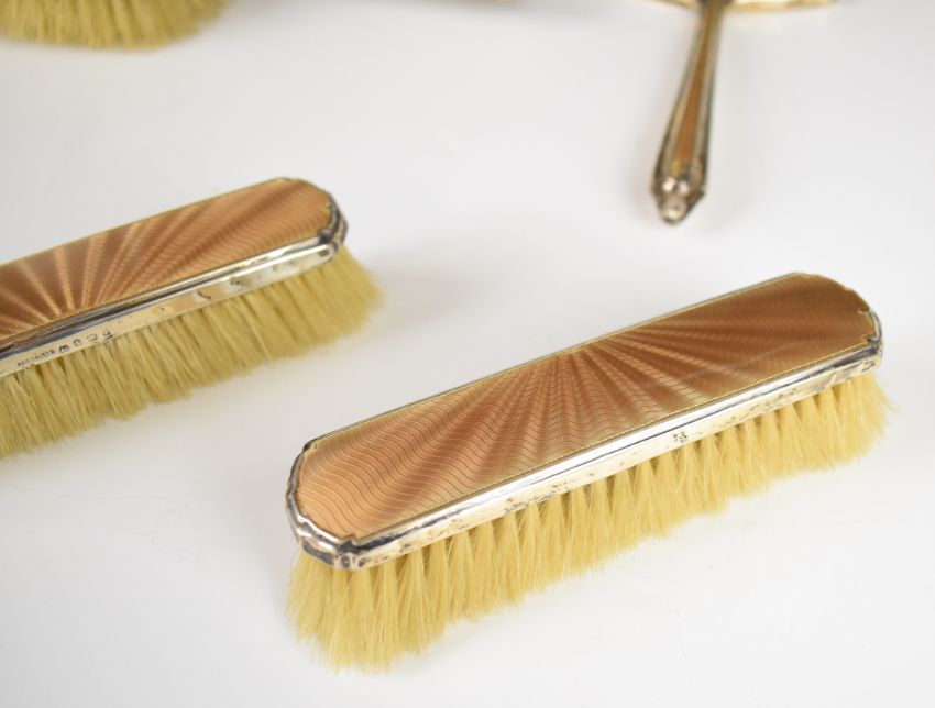 Art Deco hallmarked silver and pink guilloché enamel dressing table set comprising hand mirror and four brushes, Birmingham 1933, maker Albert Carter, length of hand mirror 16.5cm