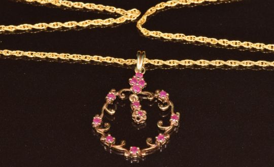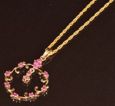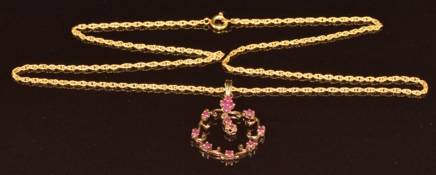 A 9ct gold pendant set with rubies, on 9ct gold chain, 5.8g, 49cm, 3.4cm