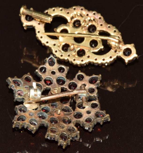 A 9ct gold brooch set with Bohemian cut garnets (5.1g, 3.5cm) and a silver gilt brooch set with Bohemian cut garnets (2.6cm)