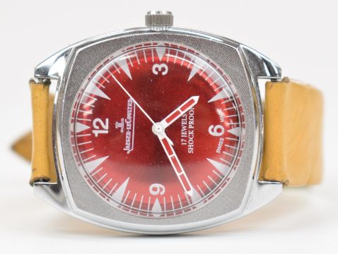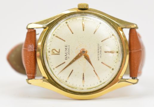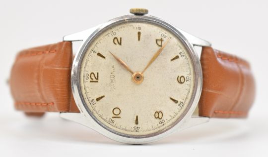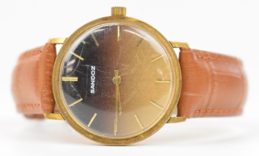 Six various gentleman's wristwatches comprising Lemania, Eterna, Sandoz, Baume, Smiths and one other, in brown leather display / travel cases.