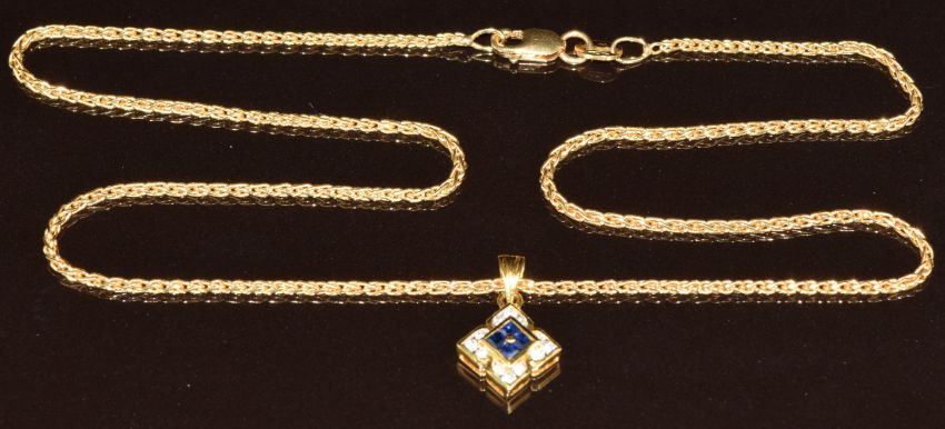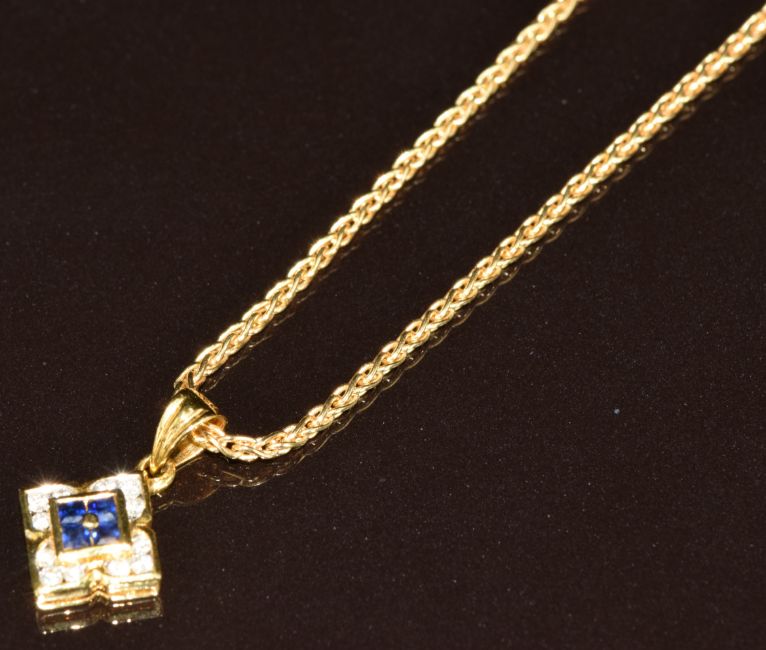 An 18k gold pendant set with sapphires and diamonds, on 18k gold chain