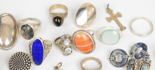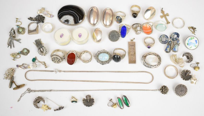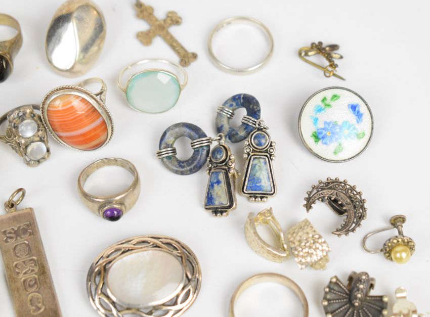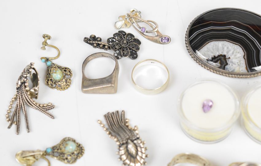 A collection of mainly silver jewellery including fifteen silver rings, one an Arts & Crafts example set with moonstone, eight pairs of earrings, an ingot, four brooches (one set with enamel), pendant, cross, etc., with two loose pear cut amethysts and a pair of Pierre Lorion Sylvia Karels earrings, 210g of silver
