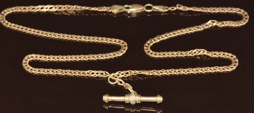 A 9ct gold chain with T bar pendant set with diamonds, 7.5g, 45cm