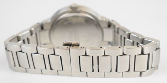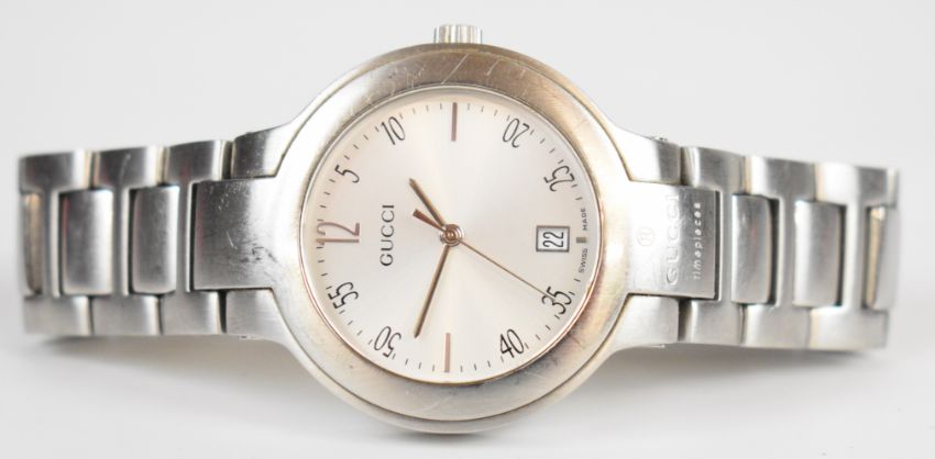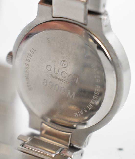 Gucci wristwatch ref. 8900M with date aperture, Arabic numerals, silver hands and dial, stainless steel case and quartz movement, on stainless steel bracelet, case diameter 35mm, in original box with spare bracelet links.