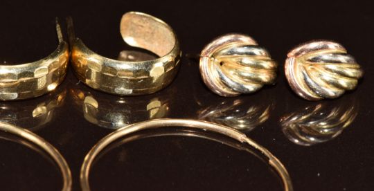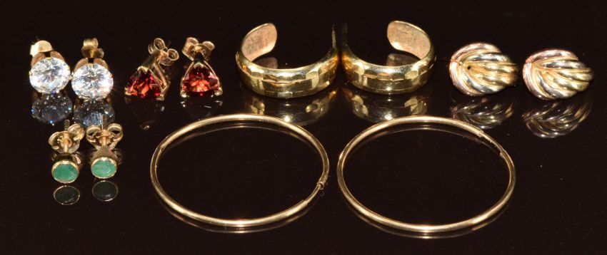 Six pairs of 9ct gold earrings including emerald, garnet, hoops, etc, 7.3g