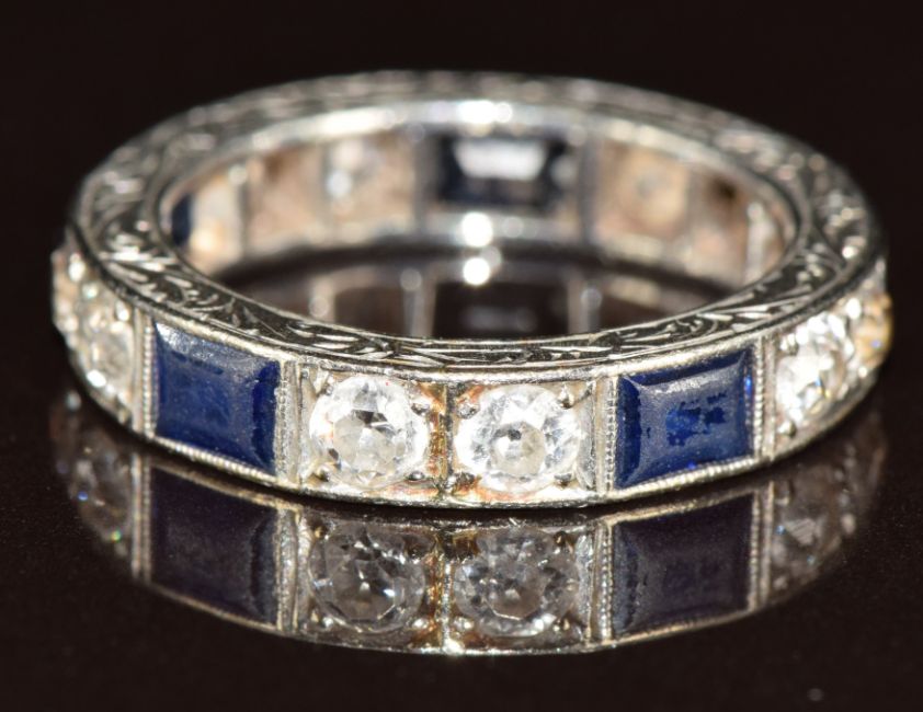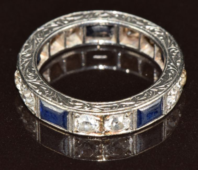 Art Deco platinum eternity ring set with old cut diamonds and rectangular sapphires with engraved decoration to the inner and outer band, 5.9g, size J