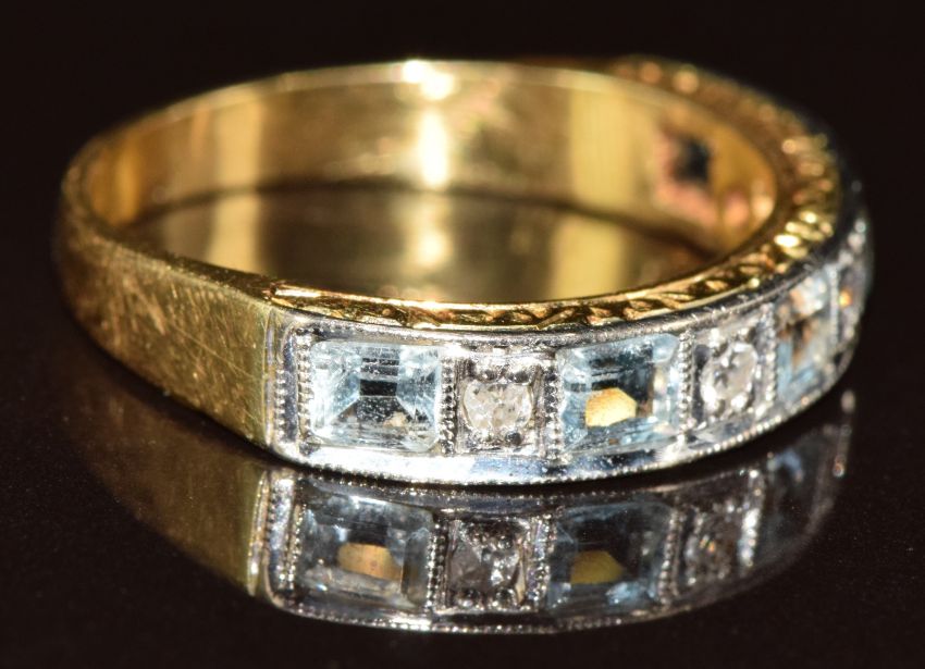 A c1930 18ct gold ring set with rectangular cut aquamarines and diamonds, 4.8g, size O