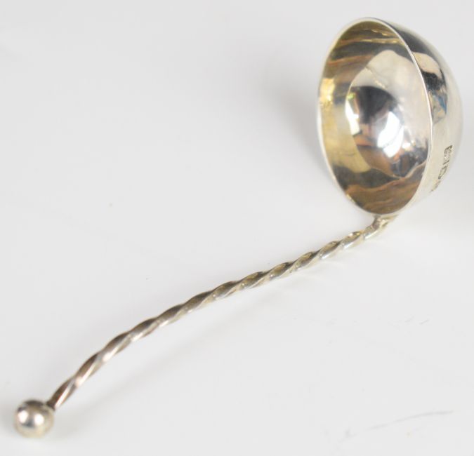 Edward VII hallmarked silver swing handled basket with blue glass liner and matching ladle with twisted handle, London 1909, maker Carrington & Co, with Vintners Company 1910 inscription to base, height excluding handle 6cm, weight excluding liner 74g
