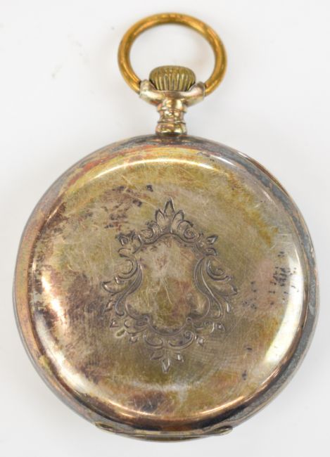 Omega silver keyless winding open faced pocket watch with subsidiary seconds dial, ornate gold hands, black Roman numerals, white dial and unsigned movement, case diameter 52mm, serial number 1706006.