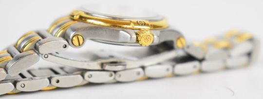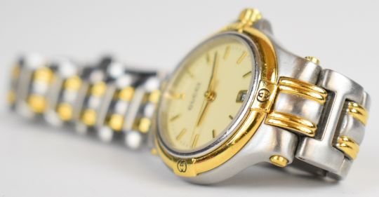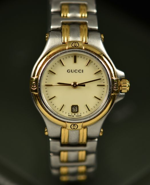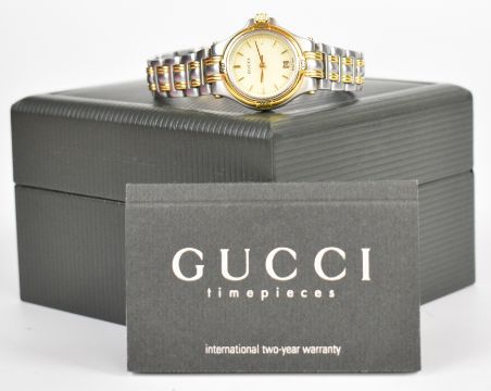 Gucci ladies wristwatch ref. 9040L with date aperture, gold hands and hour markers, champagne dial, gold bezel, stainless steel case and quartz movement, on bi-metal bracelet, case diameter 26mm, in original box with spare bracelet link and related paperwork.