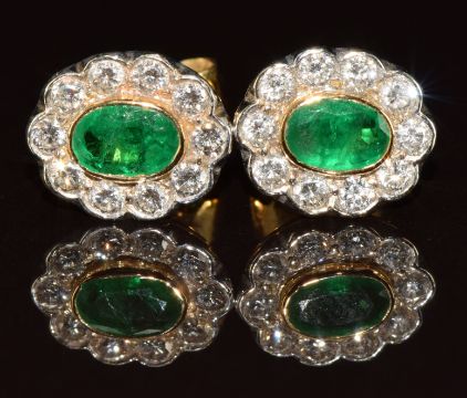 A pair of 18ct gold earrings each set with an oval cut emerald of approximately 0.45ct surrounded by ten diamonds, 4g
