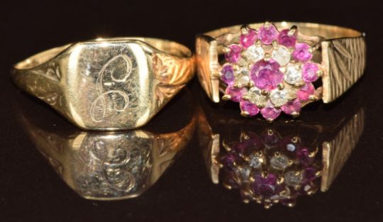 A 9ct gold signet ring and 9ct gold ring set with diamonds and rubies, size Q & O, 4.1g