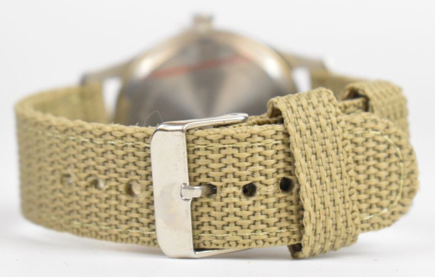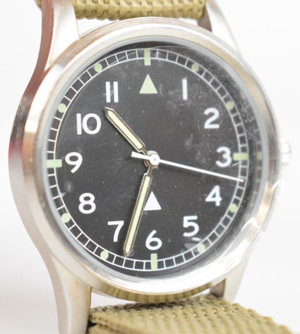 British RAF military style wristwatch with luminous hands and hour markers, white Arabic numerals, black dial, stainless steel case and quartz movement, on NATO style strap, case diameter 39mm