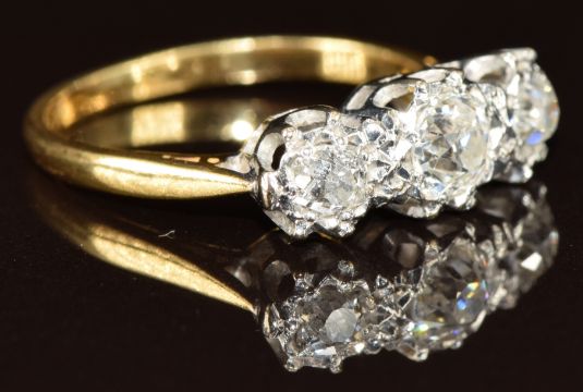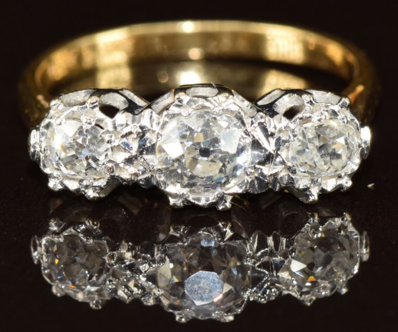 An 18ct gold ring set with three old cut diamonds measuring approximately 0.35, 0.2 & 0.2ct in a platinum setting, 4g, size N