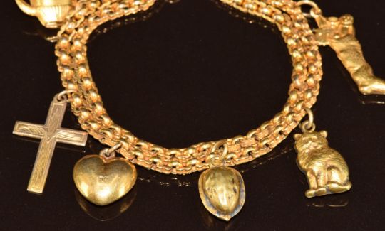 Victorian yellow metal bracelet with six 9ct gold charms including cat, heart, cross, tea pot, walnut and stocking, 15.6g, 16.5cm