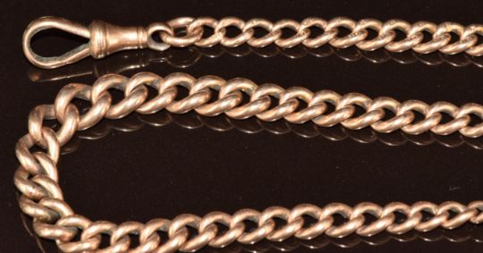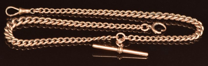 A 9ct rose gold graduated double Albert/ watch chain made up of curb links (damaged bolt clasp), 41.3g, 43cm