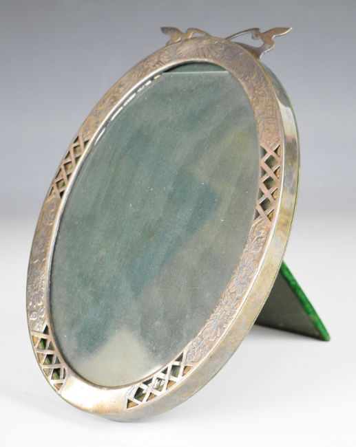 Likely American silver oval photograph frame with pierced and engraved decoration, with green velvet back, indistinctly marked 925 fine, overall height 25cm
