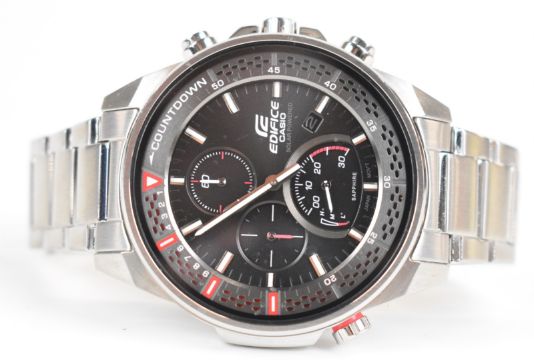 Casio Edifice gentleman's chronograph wristwatch ref. EFS-S590 with date aperture, luminous hands and hour markers, black dial, stainless steel case and quartz movement, on stainless steel bracelet, case diameter 44mm, in original box