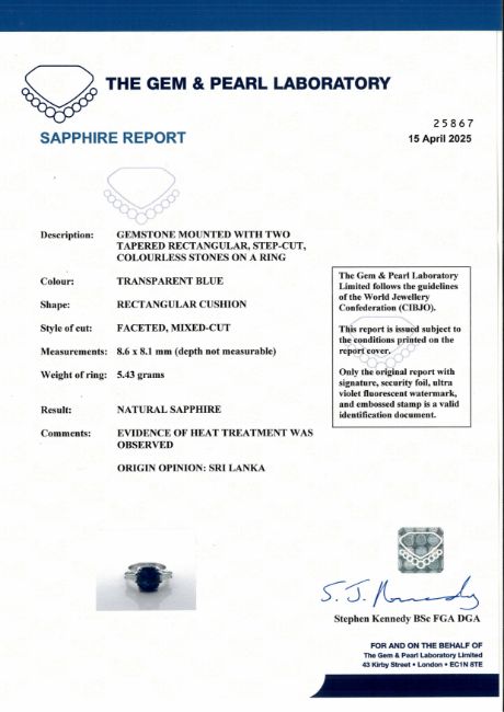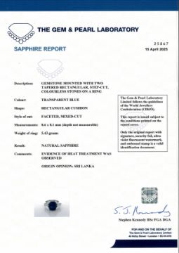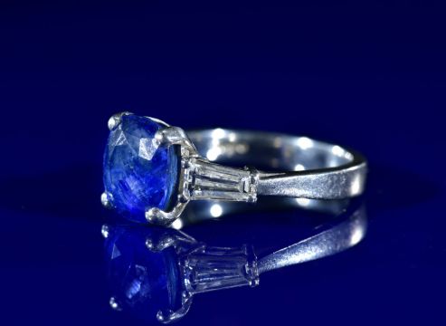 A platinum ring set with a cushion cut sapphire of approximately 3.1ct flanked by two tapered baguette cut diamonds with a total weight of 0.6ct, with Gem & Pearl Lab certificate