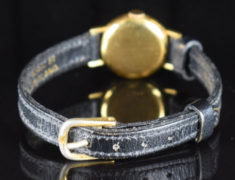 Girard Perregaux 18ct gold ladies wristwatch with gold hands and hour markers, silver dial and signed 17 jewel movement, on black leather strap, case diameter 18mm, serial number 7814A.
