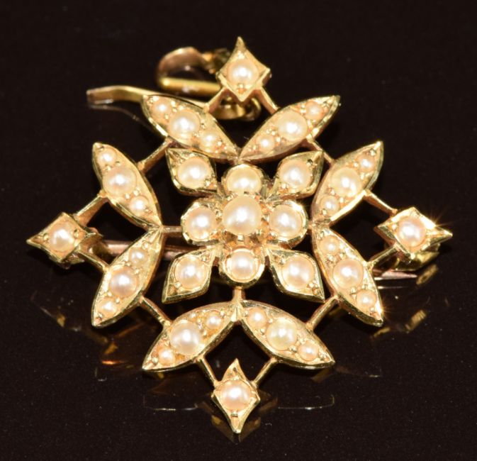 Edwardian 15ct gold pendant/ brooch set with split pearls, 6.2g, 2.6cm