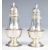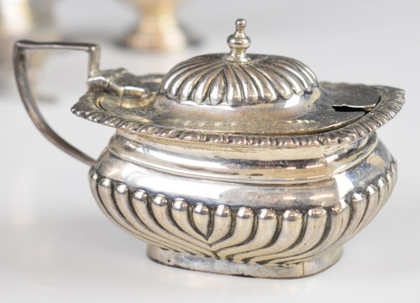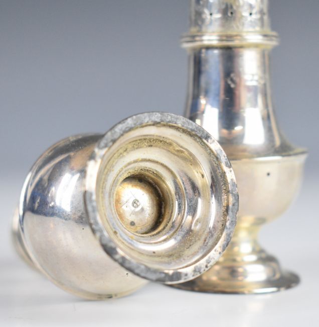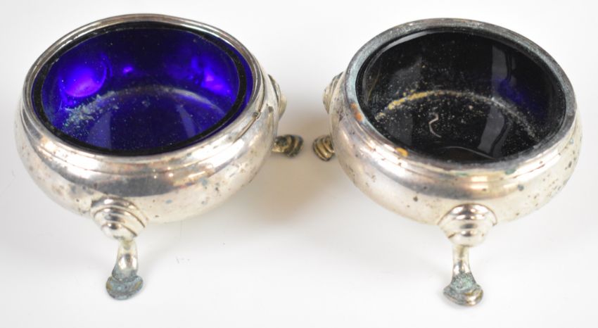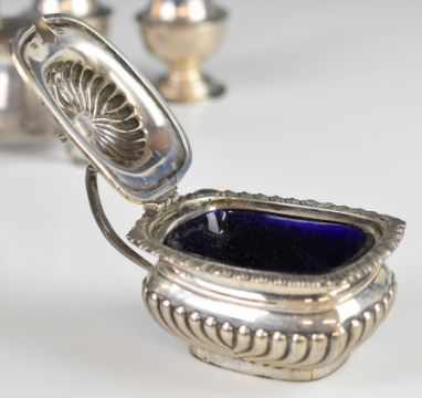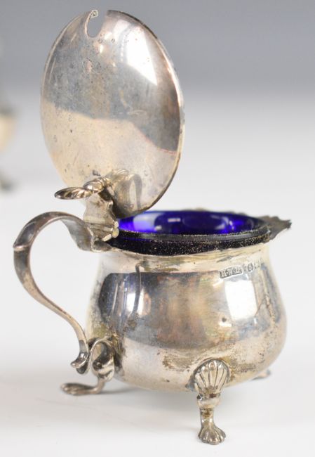 Georgian and later hallmarked silver condiments comprising pair of peppers, pair of Georgian hoof footed open salts and two mustards, weight excluding liners 300g