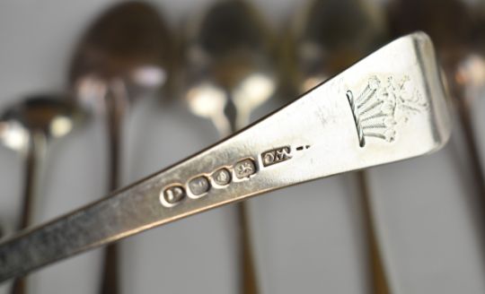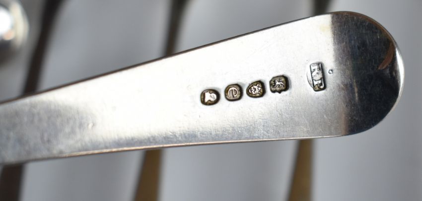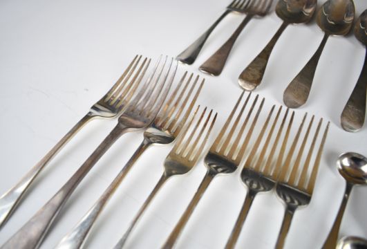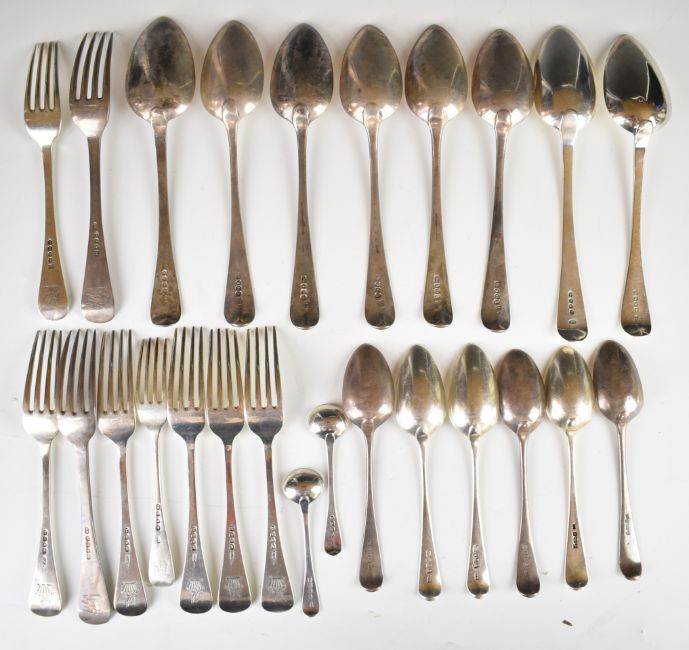 Georgian and later hallmarked silver harlequin canteen of Old English pattern cutlery comprising eight table spoons, eight table forks, six dessert spoons, dessert fork and two salt spoons, various dates and makers, length of longest 20.5cm, weight of all items 1312g