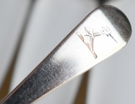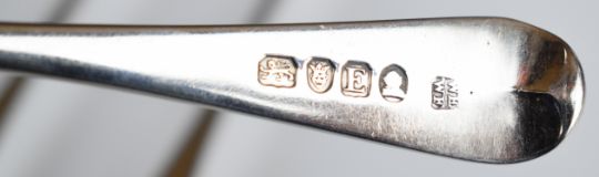 Set of six Georgian hallmarked silver Old English pattern dessert spoons, London 1800, maker  William Eley I & William Fearn, length 17.5cm, weight 190g