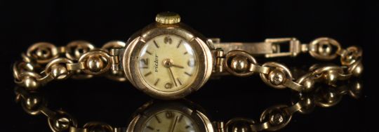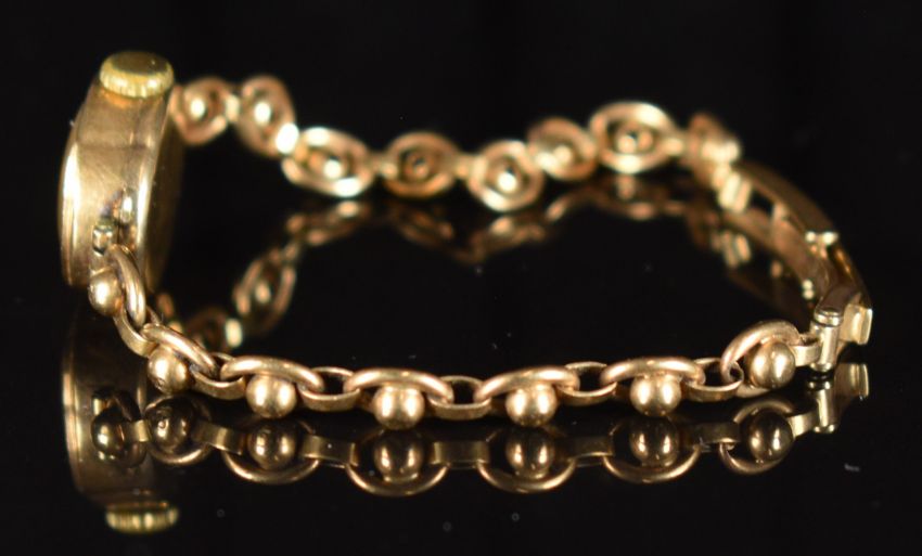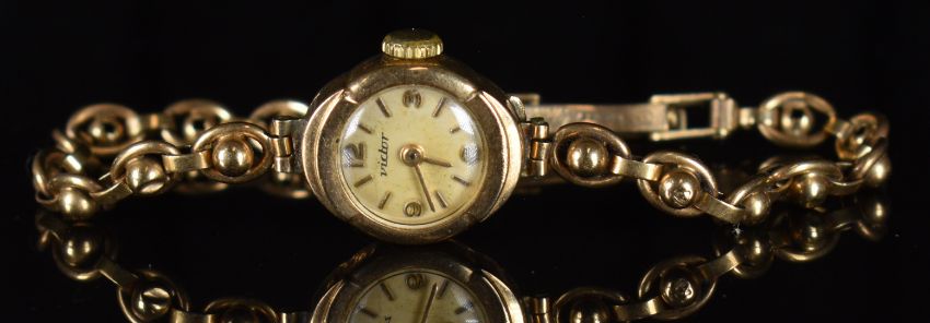 Victor 9ct gold ladies wristwatch with gold hands and hour markers, silver dial and signed 15 jewel movement, on 9ct gold bracelet, case diameter 15mm, serial number 48701, 10.7g.