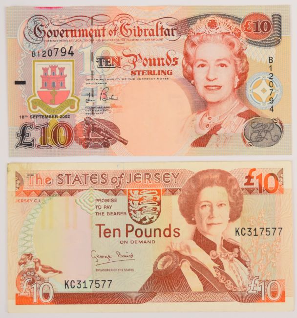 Scottish, Channel Islands and Gibraltar banknotes comprising Bank of Scotland £20 and £1, Clydesdale Bank £1, RBS £10, £5 and 3x £1, Gibraltar £10, Jersey £10, £5 and 5 x £1 and two Guernsey £1