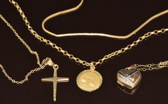 Four 9ct gold chains, 9ct gold cross, 9ct gold locket and a 9ct gold pendant, 11g