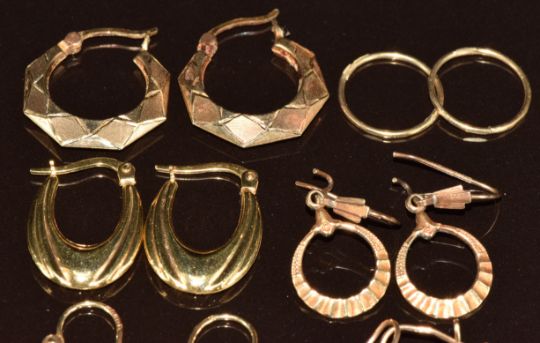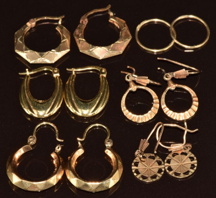 Five pairs of 9ct gold earrings including hoops, faceted, etc, (5.8g) and a pair of 18ct gold hoop earrings (1.8g)