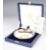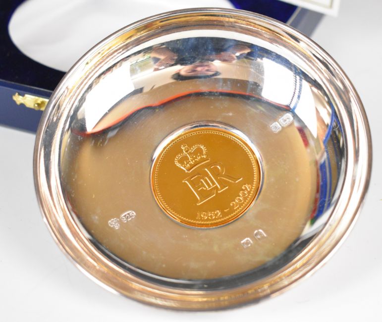 Cased Elizabeth II limited edition feature hallmarked silver commemorative dish set with a gilt metal medallion, Sheffield 2002, maker C J Vander Ltd, diameter 11.5cm, weight excluding medallion 89g