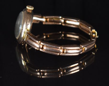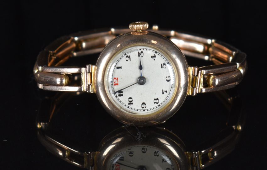 Edwardian 9ct gold ladies wristwatch with blued hands black Arabic numerals, silver dial and unsigned movement, on 9ct gold expanding bracelet, case diameter 26mm, serial number 18432, 23.4g.