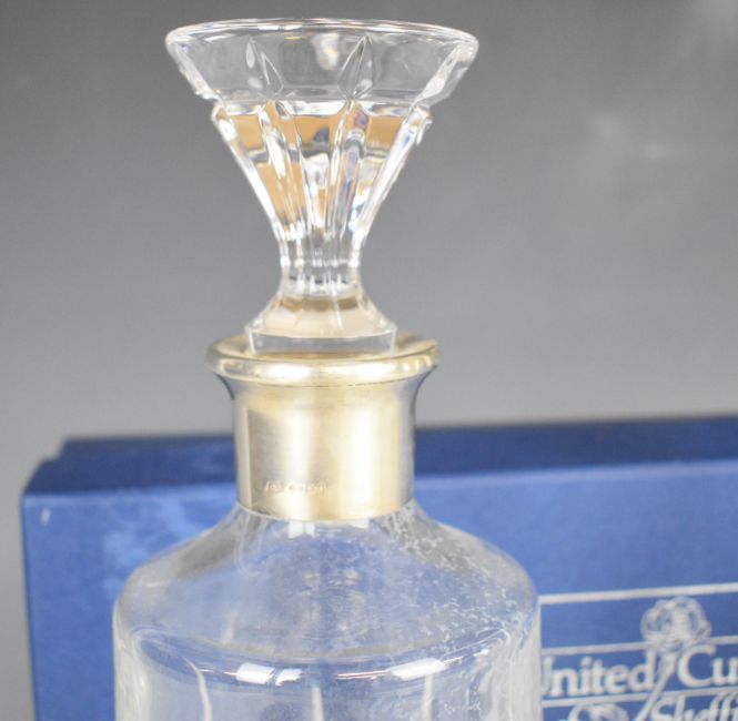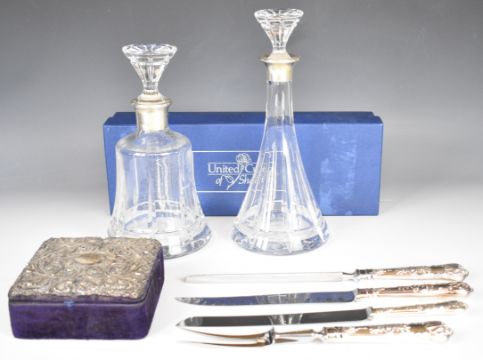 Hallmarked silver mounted items comprising two cut glass decanters with silver collars, velvet box with embossed silver panel to lid and a King's pattern hallmarked silver handled carving set and bread knife