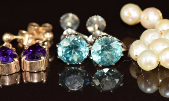 A pair of 9ct white gold earrings each set with a round cut zircon, a pair of 9ct gold earrings set with cultured pearls and a pair of 9ct gold earrings each set with a pear cut amethyst, 11.5g