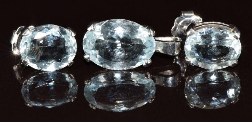 A white metal pendant set with an oval cut aquamarine of approximately 4ct and a pair of 18ct white gold earrings each set with an oval cut aquamarine of approximately 2ct, 6.4g