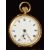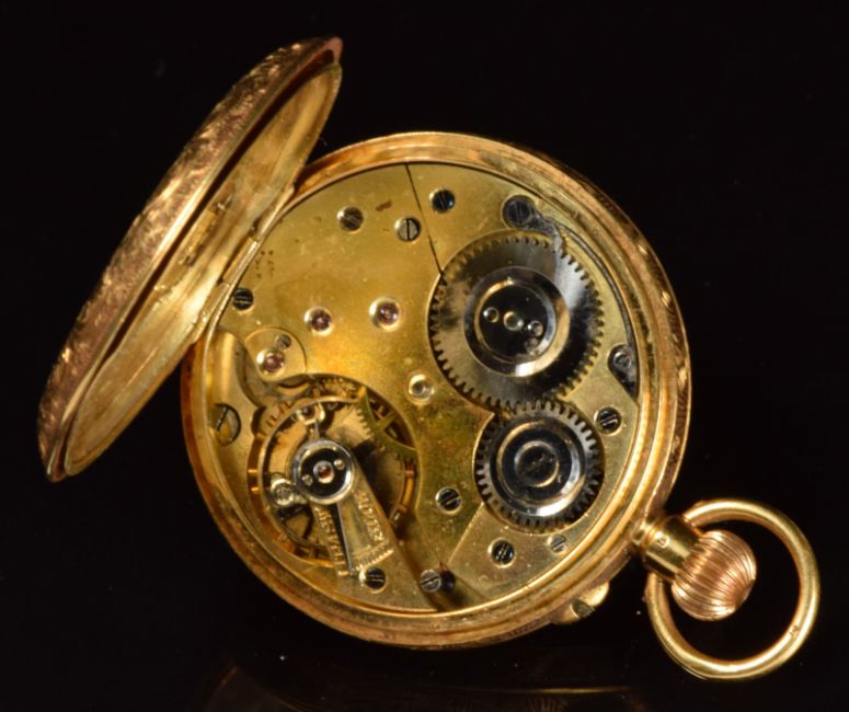 Unnamed 18ct gold keyless winding open faced pocket watch with blued hands, black Roman numerals, white enamel dial, engraved case and unsigned movement, case diameter 33mm, serial number 103364, 28.4g.