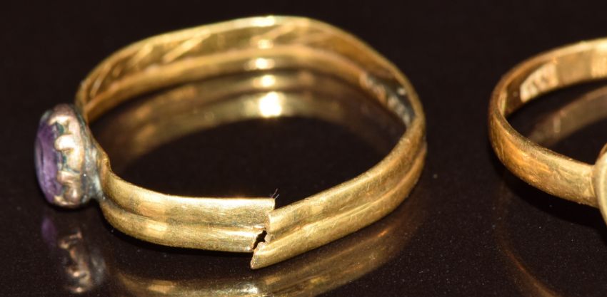 A 22ct gold ring with a heart set with a pearl engraved 1900 (1.6g) and a yellow metal ring (damaged)
