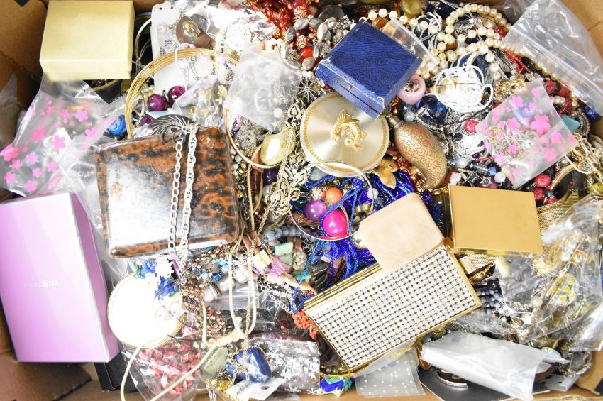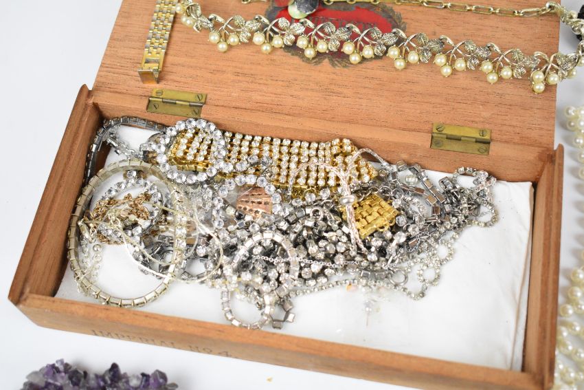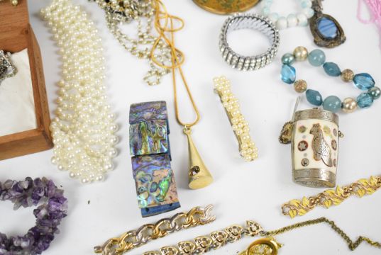 A collection of costume jewellery including beaded necklaces, Stratton compacts, amethyst necklace, abalone, Jewelcraft and paste set bracelets, pearl necklace, etc