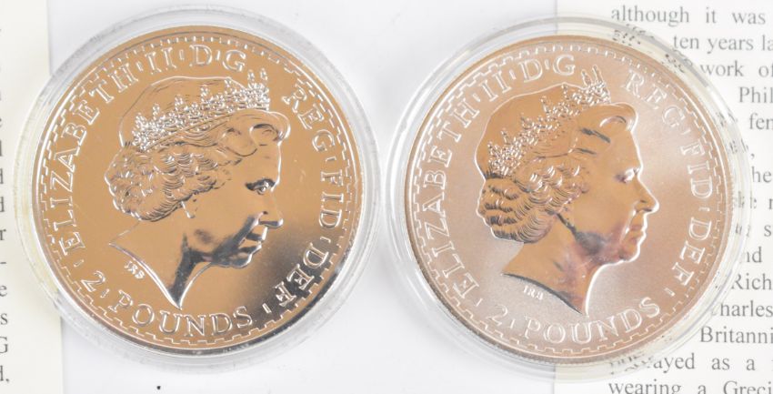 Four one ounce silver Britannia coins comprising 2000 and 2001 examples on Royal Mint cards and 2002 and 2005 examples with Westminster certificates