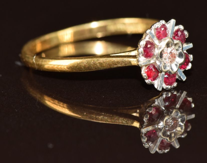 An 18ct gold ring set with a diamond surrounded by rubies in a cluster, 2.7g, size O
