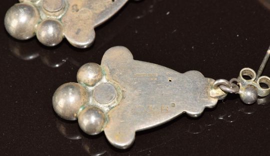 Georg Jensen pair of silver earrings marked 32B, Victorian white metal bangle with applied gold leaf decoration and Victorian white metal horseshoe charm/ pendant