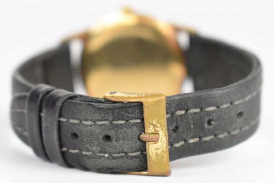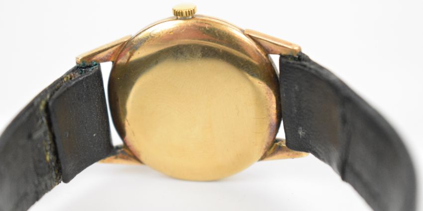 Cyma Cymaflex 9ct gold gentleman's wristwatch with subsidiary seconds dial, gold hands and Arabic numerals, silver dial and signed 17 jewel calibre R458 movement, on black leather strap, case diameter 30mm, serial number 526199.